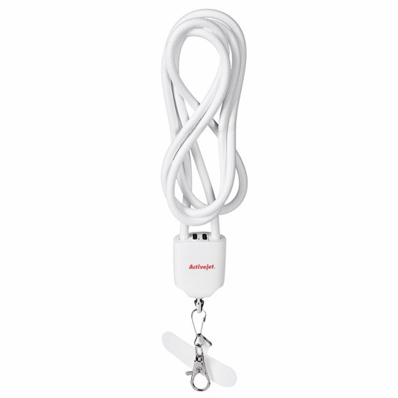 Activejet smycz z przewodem do ładowania 3w1 biała. Końcówki z różnymi złączami: USB-C, Adapter Lightning, USB-A.
