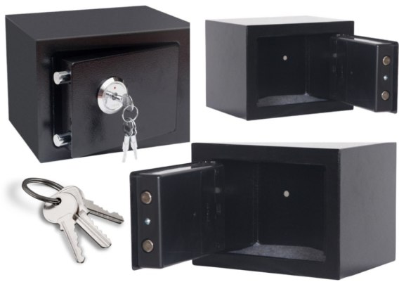 Zestaw zawiera: sejf, 3 kluczyki, 2 kołki montażowe ze śrubkami