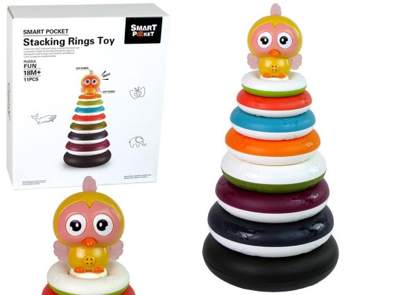 Zestaw składa się z kilku rodzaju pierścieni różnej wielkości. Jedną z możliwości jest układanie pierścieni według wyobraźni dziecka. Umieszczona na szczycie piramidy żółta kaczuszka dodatkowo uatrakcyjnia całą zabawę, grzechocząc. Jej skrzydełka zrobione są z miękkiej gumy, co może posłużyć jako gryzak. Barwna kolorystyka ze zwierzątkami pomoże w rozwoju Twojego dziecka i poznawania otaczającego go świata. Na piramidce znajdują się również podobizny zwierząt odpowiadające odpowiednim okręgom. Maluch przy układaniu wieży może sugerować się obrazkami.