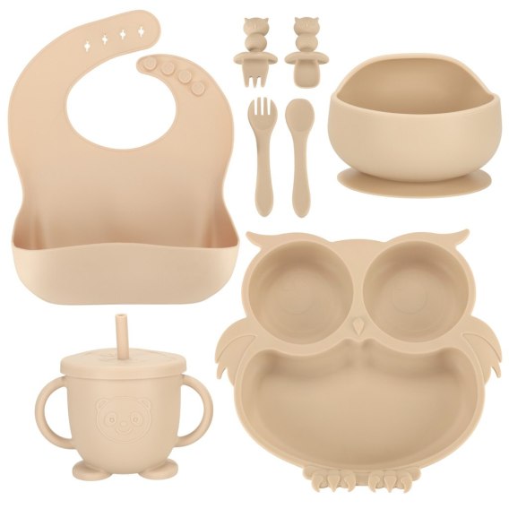 Naczynia silikonowe dla dzieci sowa zestaw 8 elementów beżowe