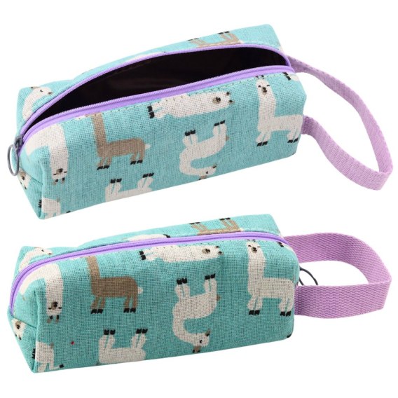 • Wymiary: ok. 20 x 8,5 x 6,5 cm • Materiał: tkanina tekstylna • Kolor: turkusowy z motywem lam, fioletowy suwak i uchwyt