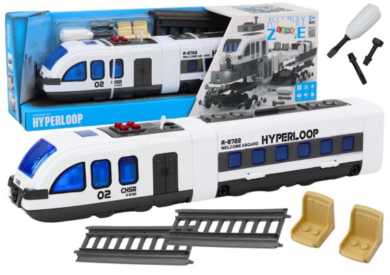 Pociąg utrzymany jest w klasycznej bieli z szarymi elementami, co nadaje mu stylowy i realistyczny wygląd. Wyposażony jest w efekty dźwiękowe oraz świetlne, które dodatkowo wzbogacają zabawę. Na dachu pociągu znajdują się cztery przyciski w kolorze czerwonym, każdy z nich odpowiada za inny dźwięk, takie jak sygnał odjazdu, stukot kół czy dźwięk pociągu w ruchu. W zestawie znajdują się dwie śrubki i śrubokręt, które umożliwiają dzieciom rozkręcanie i składanie pociągu. Ta funkcjonalność nie tylko bawi, ale również uczy dzieci podstawowych umiejętności majsterkowania, cierpliwości oraz precyzji. Do zestawu dołączone są dwa tory, które umożliwiają po złożeniu pociągu używanie go jako figurki. Tory można łatwo łączyć, tworząc trasę, po której pociąg może się poruszać, co dodaje zabawie realizmu i interaktywności.