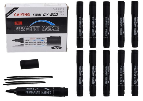 Zestaw 10 czarnych markerów permanentnych z okrągłą końcówką to idealne narzędzie do trwałego pisania i oznaczania. Szybkoschnący, wodoodporny tusz zapewnia odporność na zmywanie. Doskonałe do papieru, plastiku, metalu i szkła.