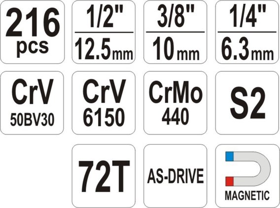 nasadki: 1/2" (12.7 mm): 10, 11, 12, 13, 14, 15, 17, 19, 20, 21, 22, 24 mm (L=38 mm); 27, 30, 32 mm (L=42 mm) |
